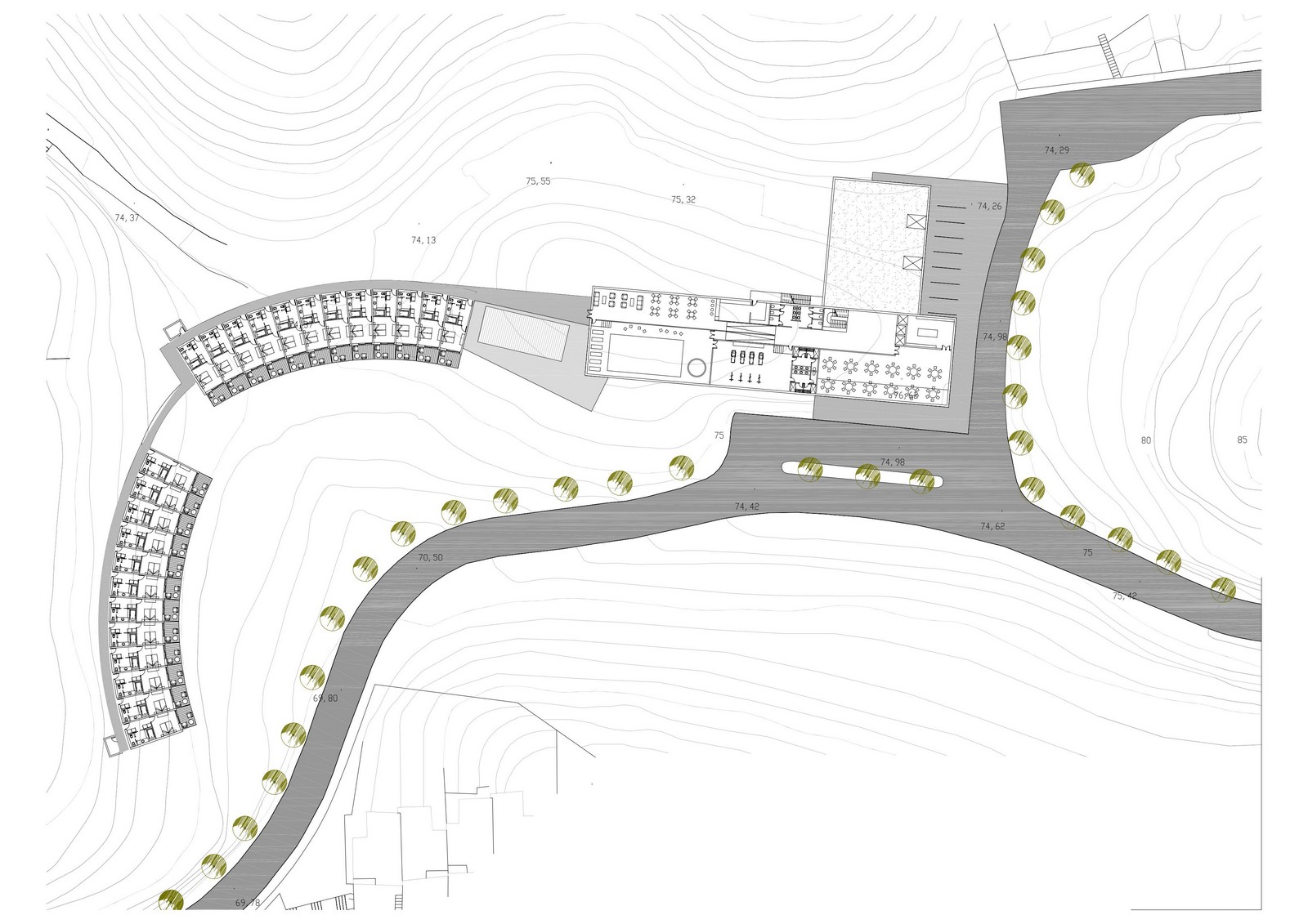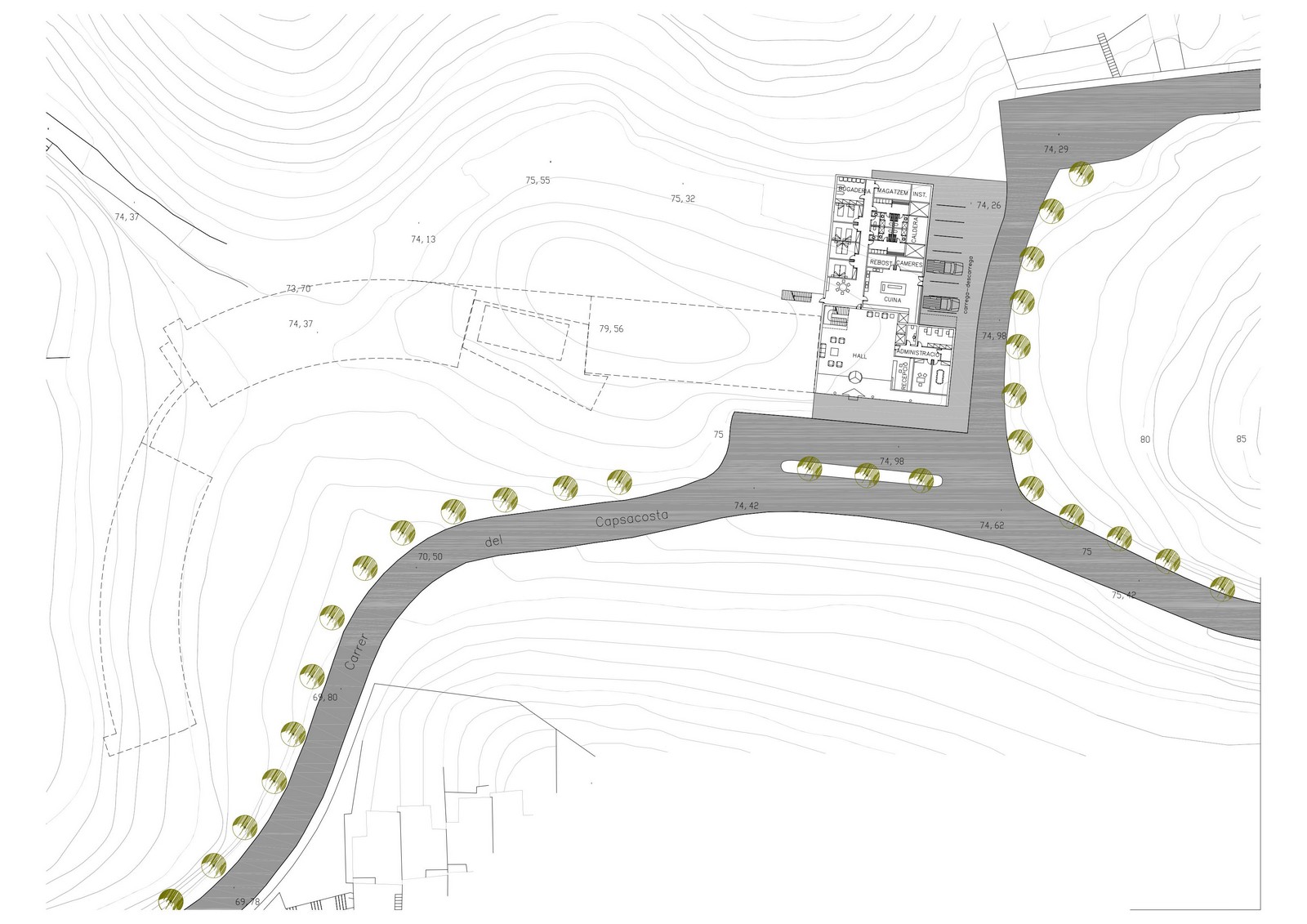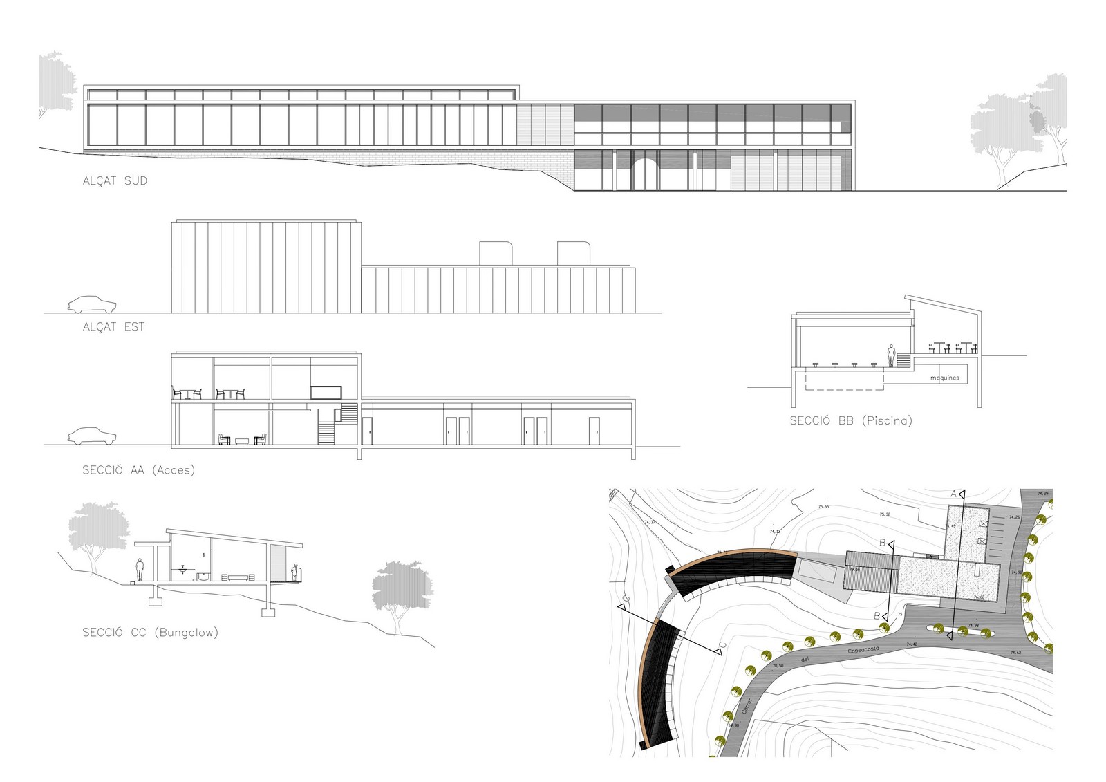 La naturalesa del terreny, un petit turó de suaus pendents, és l’element director de la implantació dels diferents edificis que conformaven el projecte de l’establiment. Les línies horitzontals van permetre integrar els volums en el paisatge i situar-los de forma discreta sobre el solar.